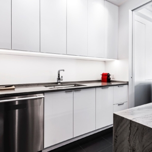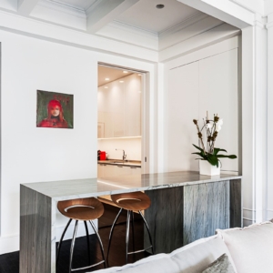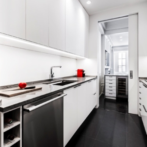 This time around, the current client wanted a fresh, white palate in a contemporary galley kitchen. This new renovation features a custom-built dining island through a pocket door from the kitchen to the living room.